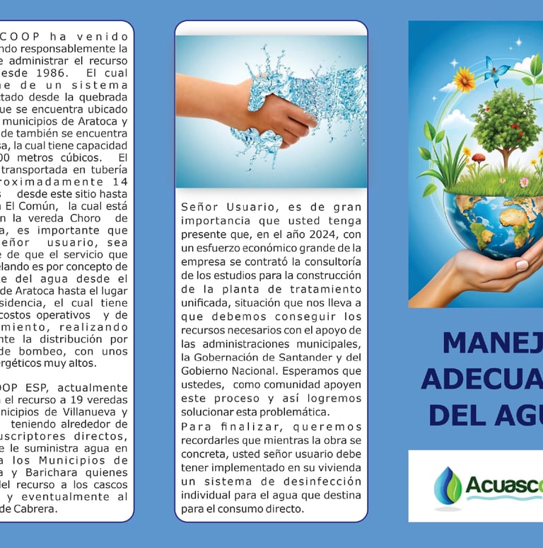 Establecida en 1986, ha administrado responsablemente el recurso hídrico, interconectando las fuentes desde la quebrada La Laja —ubicada entre los municipios de Aratoca y Curití— hasta la represa El Común. El agua es transportada por tubería, principalmente mediante bombeo, desde el municipio de Aratoca hasta las residencias de sus suscriptores.